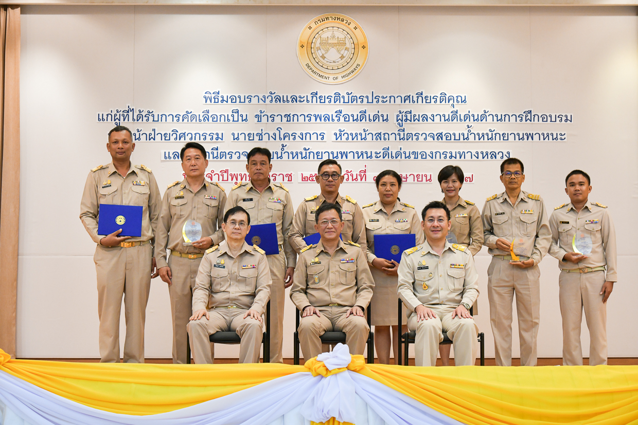 แขวงทางหลวงหนองบัวลำภู ขอแสดงความยินดีกับข้าราชการพลเรือนดีเด่น และผู้มีผลงานดีเด่นด้านการฝึกอบรม หัวหน้าฝ่ายวิศวกรรม นายช่างโครงการ หัวหน้าสถานีตรวจสอบน้ำหนักยานพาหนะ และสถานีตรวจสอบน้ำหนักยานพาหนะดีเด่น ของกรมทางหลวง ประจำปี พ.ศ. 2566 ในวันที่ 3 เมษายน 2567 นายสราวุธ ทรงศิวิไล อธิบดีกรมทางหลวง ได้เป็นประธานในพิธีมอบรางวัลและเกียรติบัตรประกาศเกียรติคุณ ข้าราชการพลเรือนดีเด่น และผู้มีผลงานดีเด่นด้านการฝึกอบรม หัวหน้าฝ่ายวิศวกรรม นายช่างโครงการ หัวหน้าสถานีตรวจสอบน้ำหนักยานพาหนะ และสถานีตรวจสอบน้ำหนักยานพาหนะดีเด่น ของกรมทางหลวง ประจำปี พ.ศ. 2566 เนื่องในโอกาสวันคล้ายวันสถาปนากรมทางหลวง ปีที่ 112